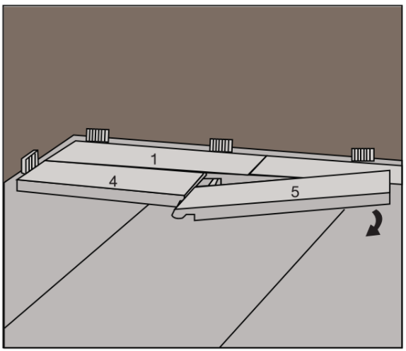 5. ประกอบแผ่นที่ 2 เข้ากับแผ่นแรกไปทางด้านขวาเอียงประมาณ 45 องศา แล้วกดลงเพื่อให้ไม้เท้าล็อคโดยใช้ค้อนยางเคาะเบาๆ ให้รอยต่อสนิท